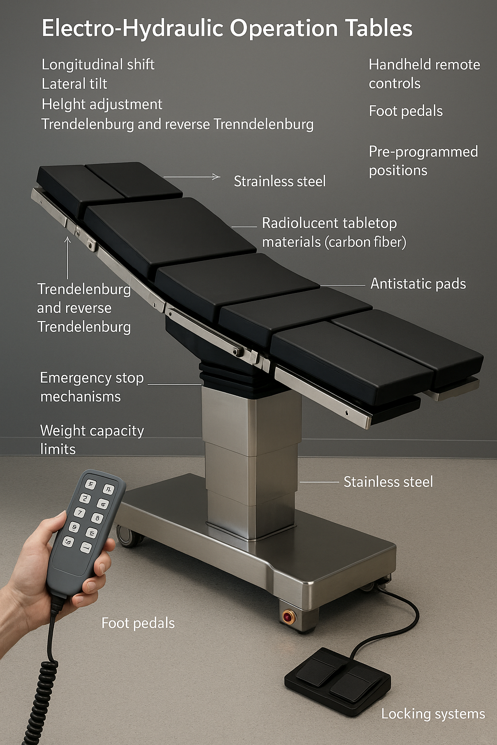 Az elektrohidraulikus kezelőasztal felépítéséhez használt anyagokat úgy választották meg, hogy megfeleljenek a sebészeti környezet funkcionális és biztonsági szabványainak. Az asztalkerethez általában rozsdamentes acélt használnak tartóssága, korrózióállósága és könnyű tisztíthatósága miatt. A gyakran szénszálból készült, sugárzó áttetsző asztali anyagokat úgy tervezték, hogy támogassák a képalkotási eljárásokat, például a röntgensugárzást és a C-karokat, anélkül, hogy a képminőséget zavarnák. Az antisztatikus betétek az asztallap felületébe vannak beépítve, hogy fokozzák a páciens biztonságát azáltal, hogy megakadályozzák a sztatikus kisülést a műtőben.