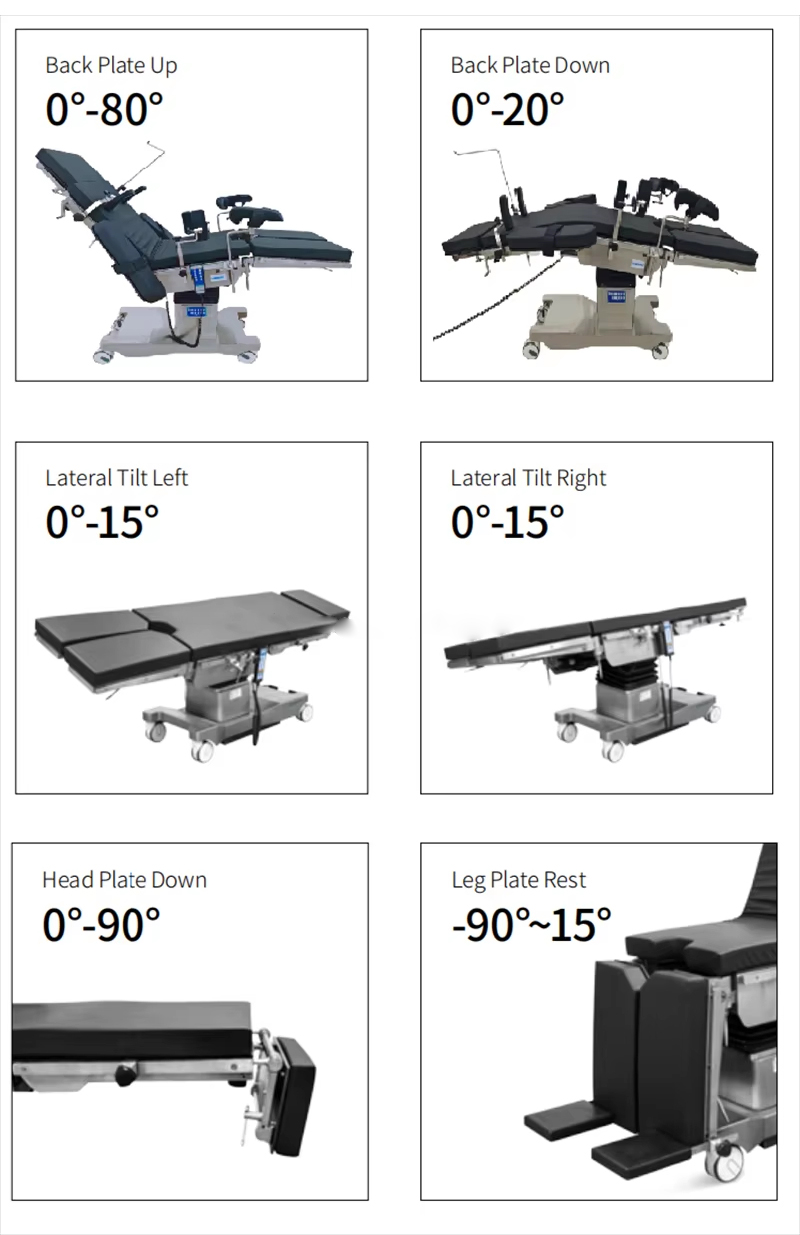 Az asztal négy részre van osztva: fej, hát (beleértve a derékhídat), csípő- és lábrész; Az asztallap nagy szilárdságú kompozit anyagból készült, röntgensugárzással; C-karral együtt lehet fényképezni.